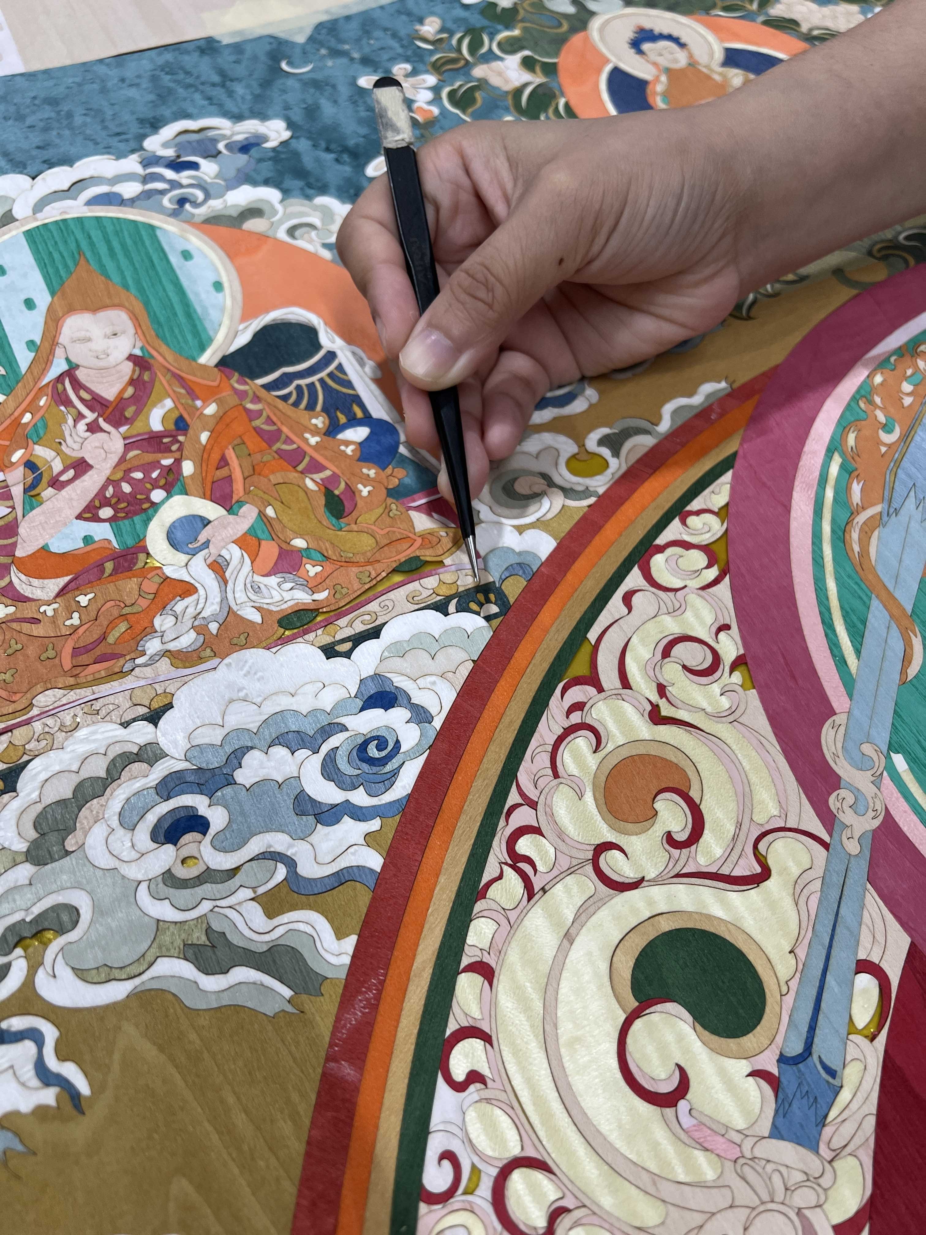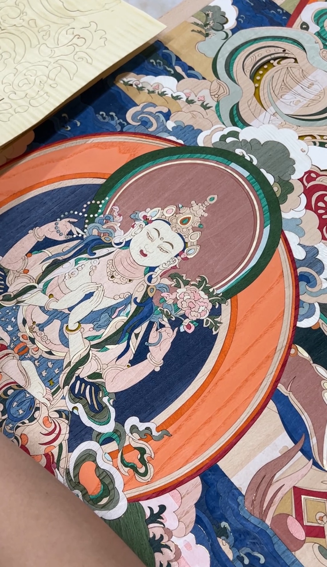 【product size】: 100*70 【price】:$25194 【materials】:venner 【product introduction】: This is a Thangka inlaid with wood veneers. The content of the picture is Manjusri Bodhisattva, who symbolizes wisdom and compassion.